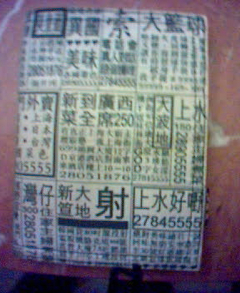 「大籃球 / 堅韌大皮球 / 又彈又硬,迴轉力強 / 讓你得到前所未有的射球快感 / 想一試身手快D打 / 99999-169-999」、「上水 / 住家主婦煮菜」…這些廣告真是棒啊。(雖然這包皮因為功能性太爛而註定不會被我拿來公開使用)