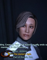 菜鳥隊員Jenkins在遊戲開始沒多久,就因為幼稚的對話而立起了死亡的旗標;但他的陣亡並非沒有代價,主角Shephard第一個可以攻略(nanpa)的對象Ashely因此獲得登場的機會。不過Ashely的長相令我想起HL2的女主角Alyx…似乎都有點英氣逼人,一時間無法激起博士內心太大的漣漪。但Ashely應該是個尾勁很強的傲嬌屬性角色吧…?