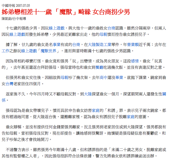 這樣的標題應該可以吸引你,因為我就這樣被吸引了,直愣愣地看著報刊那一小塊的千把字,然後搥心跺足地想,為什麼我念高中的時候沒有《魔獸世界》和女台商呢?
